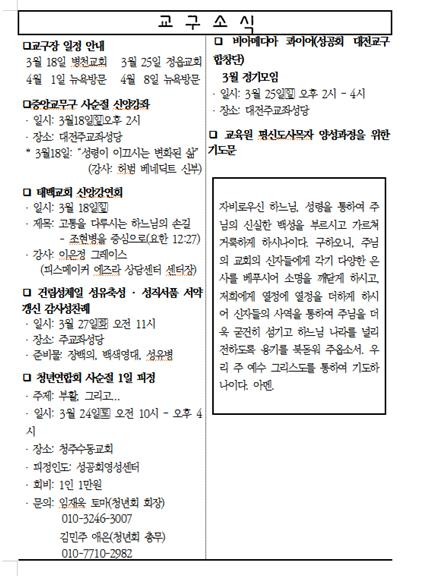 *극기헌금 : 올해는 포항성공회를 위해 극기헌금을 모금합니다. 극기 헌금함을 한 통씩 가정으로 가져가십시오. 부활주일(4월 1일)에 봉헌합니다.